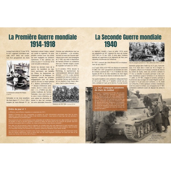 Cette BD, complétée d’un dossier illustré, présente, depuis sa création en 1918, l’histoire du 501e régiment de chars de combat : participation aux dernières offensives de la Première Guerre mondiale ; combats au Proche-Orient et en Afrique ; débarquement en Normandie le 3 août 1944, etc. Aujourd’hui, stationné à Mourmelon-le-Grand en Champagne, le régiment est impliqué dans toutes les opérations extérieures (Liban, Kosovo, Afghanistan, Mali, etc.).